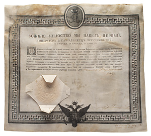 Патент Федора Елчанинова на чин статского советника. Подписи Императора Павла I и NN (автографы). Государственная печать. С.-Петербург, 30 апреля 1800 г. Бумага, чернила, сургуч; печать типографская, рукопись. Патент оформлен в декоративную картонную раму. Размеры: патента 457×507 мм, рамы 655×710 мм. Сохранность очень хорошая, следы влаги, сургуч частично утрачен. Редкий.