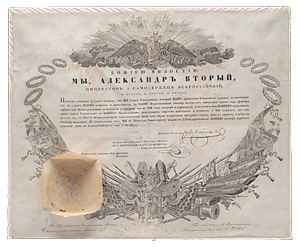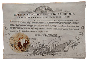Патент Сергея Ельчанинова на чин поручика. Подписи дежурного генерала Главного штаба Его Императорского Величества генерал-адъютанта П.Н.Игнатьева и вице-директора инспекторского департамента Военного министерства генерал-майора NN (автографы). Государственная печать. С.-Петербург, 6 ноября 1847 г. Бумага, чернила, сургуч; печать типографская, рукопись. Размеры 225×335 мм. Сохранность почти отличная, патент продублирован на картонную основу, сургуч практически утрачен. Редкий.