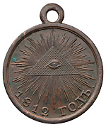 Бронзовая медаль в память Отечественной войны 1812 года была учреждена манифестом Императора Александра I 30 августа 1814 г. для награждения «отцов и старейшин» дворянских семейств и «имеющих отличные и важные заслуги» купцов. Дворяне носили медаль на ленте ордена Св. Владимира, купцы — на ленте ордена Св. Анны. Дворянству разрешалось сохранять медаль у потомков, однако, без права ношения ее потомками. Это право было установлено только в 1912 г. в дни празднования 100-летия Отечественной войны. Медали носили в петлице. Бронзовые медали раздавали на основании списков, присылаемых из губерний. Было отчеканено 64662 больших (28 мм) темно-бронзовых медалей. Надпись на об. ст. медали является непрямой цитатой из Псалтири: «Не нам, Господи, не нам, но имени Твоему даруй славу, по милости Твоей и по истине Твоей!» (Пс. 113, 9).