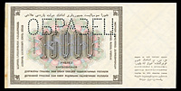 Государственный денежный знак, 15 тысяч рублей 1923 года, серия ЯЭ, № 11005. Образец. Два односторонних оттиска лицевой и оборотной сторон. Сохранность отличная, по левому краю оттисков проходит клеевая полоса. Диагональная перфорация слова «ОБРАЗЕЦ» снизу вверх на лицевой стороне и горизонтальная перфорация слова «ОБРАЗЕЦ»на оборотной стороне. Чучин# 1171. Кардаков# 4.302. Денисов# КЗ-61. Pick# 182. Кац, Малышев# 14.34. Малышев и др.# 1375 (< Р0). Рябченко# 1321. Очень редкие. (2)