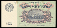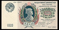 Государственный денежный знак, 10 тысяч рублей 1923 года, ЯЩ № 10114. Сохранность почти отличная, вверху билета два небольших клеевых пятна. Чучин# 1170. Кардаков# 4.301 (1 дойчмарка). Денисов# КЗ-60. Pick# 181. Кац, Малышев# 14.33. Малышев и др.# 1374 (< Р0). Рябченко# 1320. (3)