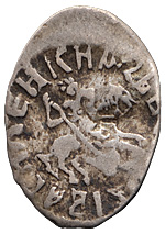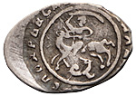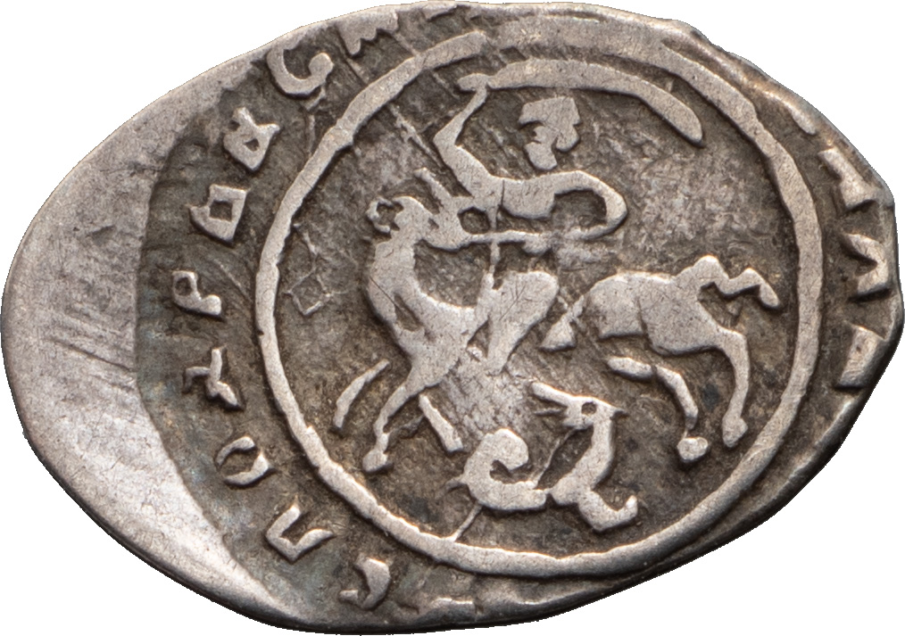 Великое княжество Московское. Василий II Темный (1425–1462). Деньга. Лиц. ст.: всадник с копьем влево, круговая надпись «КНЯЗЬ ВЕЛИКИЙ ВАСИЛИЙ». Об. ст.: всадник с саблей, под ногами коня змей, круговая надпись «ГОСПОДАРЬ ВСЕЯ РУCИ .... ». Серебро, 0,31 г. Сохранность очень хорошая, приятная патина.