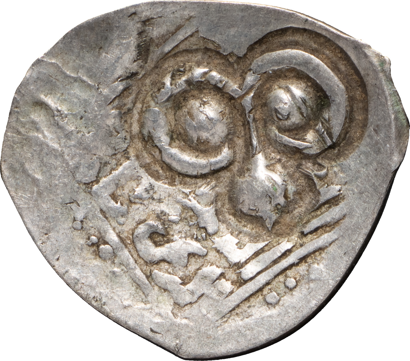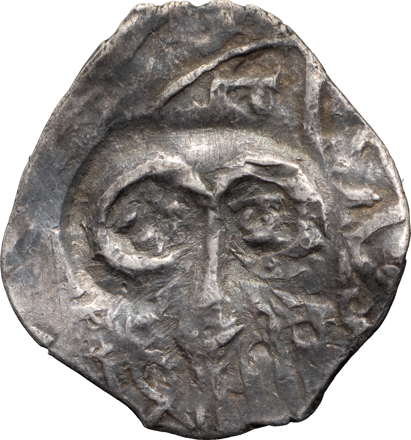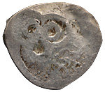Великое княжество Рязанское. (1380–1390 гг.). Деньга. Надчекан на ордынском дирхеме. Лиц. ст.: тамга крупная, с изображением голов внутри. Об. ст.: тамга в ободке из штрихов. Серебро, 1,41 г. Сохранность очень хорошая, деформация края монеты.