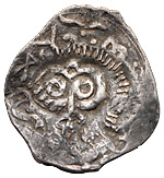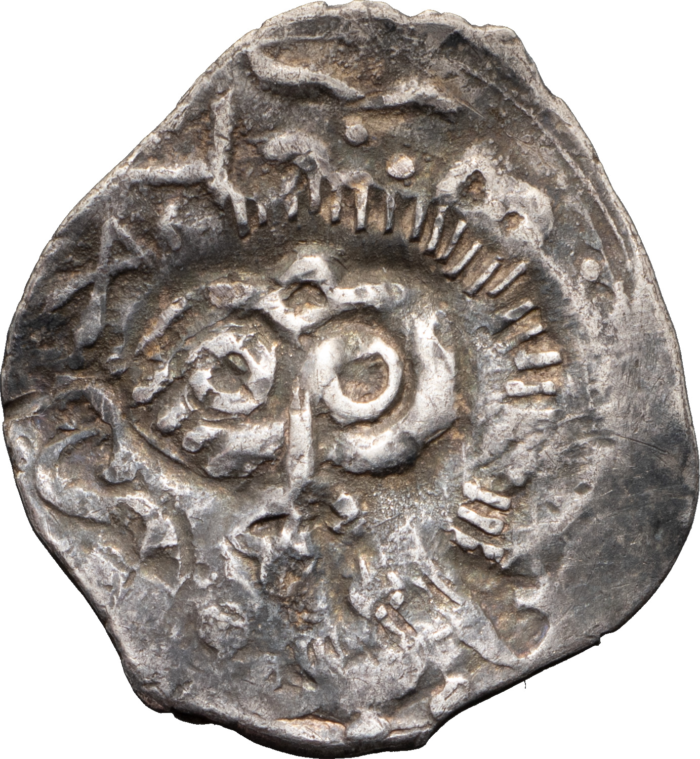 Великое Княжество Рязанское. Фёдор Ольгович (1402–1427 гг). Денга. Надчекан на подражании золотоордынскому дангу. Тамга без круговой надписи. Серебро, 1,17 г. Сохранность отличная, приятная патина.