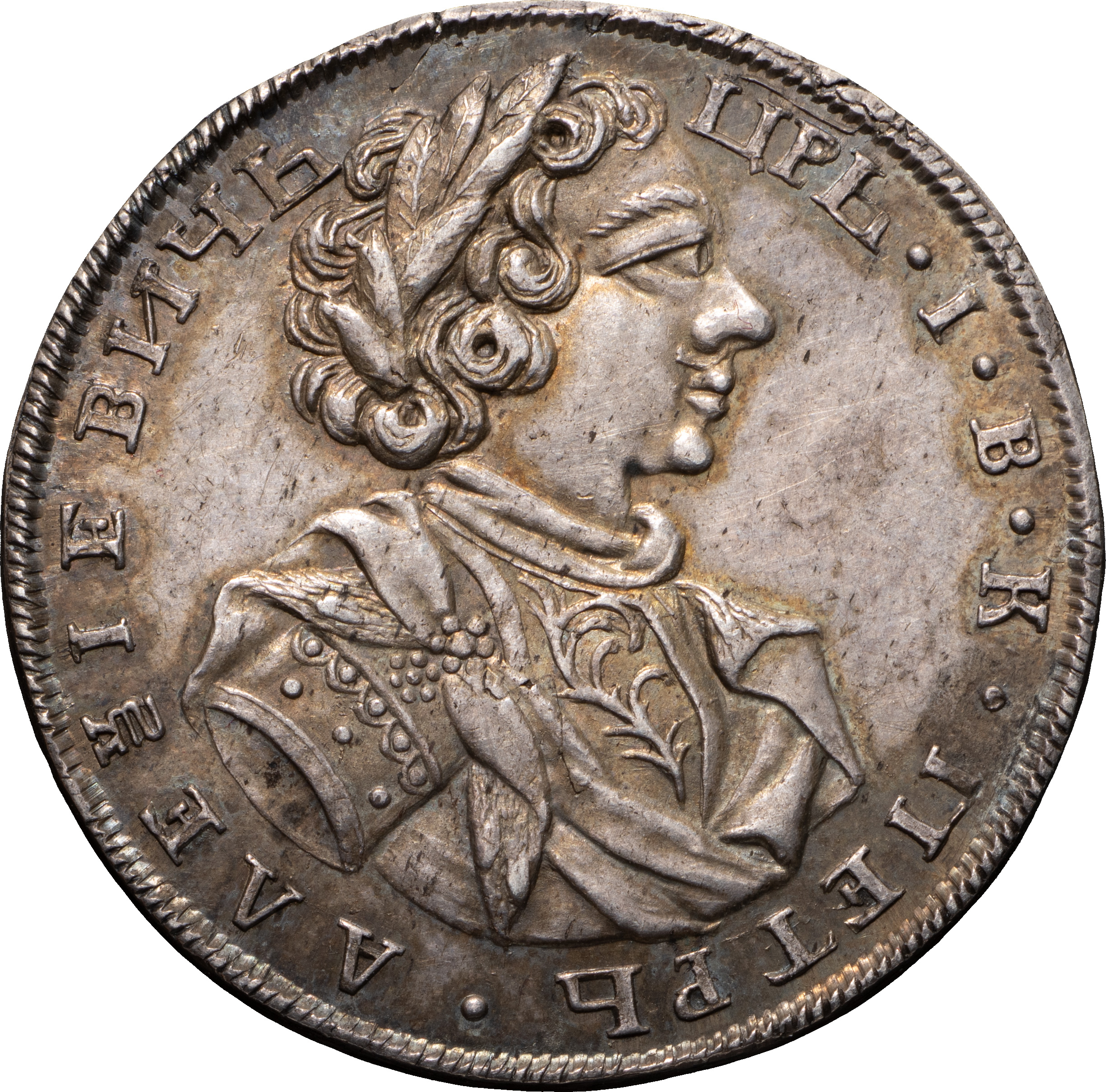 Полтина 1704 года. Без знака монетного двора. Новодел. Серебро, 13,01 г. Сохранность превосходная, очень красивая старая патина, дефекты кромки гурта. Severin# N 120 А (черта). Уздеников# Н 0467 (точка). Дьяков# N. ДьяковЗС# 98 (R2). Биткин# Н 998 (R2). Очень редкая.