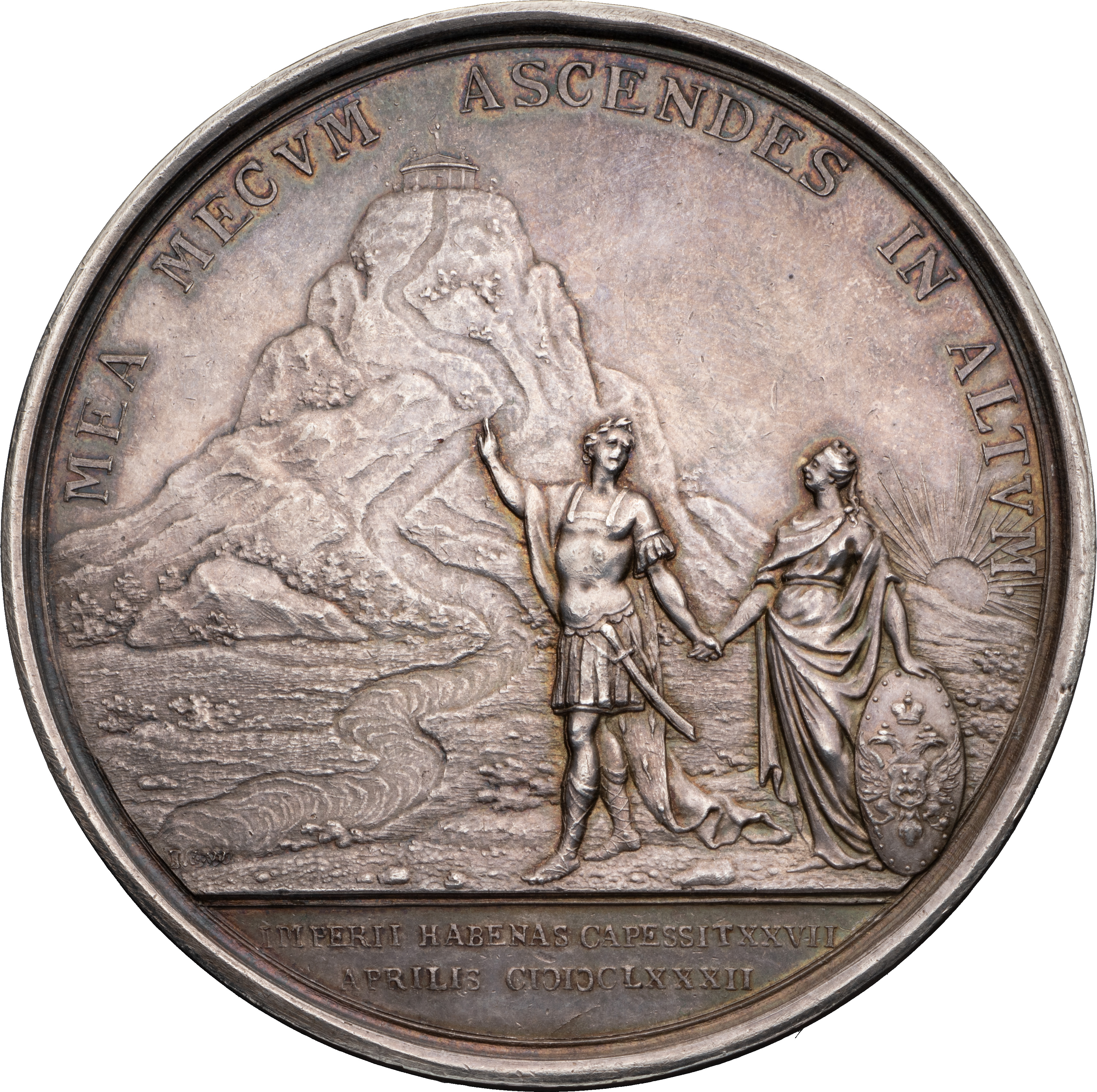Надписи (лат.): на лиц. ст. медали по окружности — «PETRVS ALEXII FILIVS•D•G•TZAR•ET•MAGNVS•DUX•TOTIUS•RVSSIÆ» (Петр, Алексея сын, Божьей милостью Царь и Великий Князь Всея Руси); на об. ст. медали: вверху по окружности — «MEA MECVM ASCENDES IN ALTVM» ([Ты] моя [и] со мной восходишь на вершину), под обрезом изображения в две строки: «IMPERII HABENAS CAPESSIT XXVII / APRILIS MDCLXXXII» (Он взял бразды правления 27 апреля 1682).