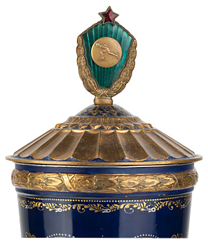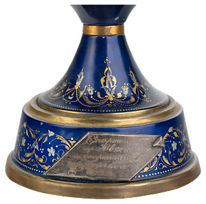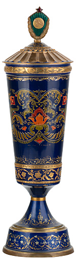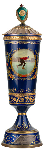 Кубок подарочный с изображениями на конькобежную тематику «Спортсменам гор. Ювяскюля (Финляндия) от спортсменов гор. Горького. 1955 г.». СССР. Москва, Эмальерная фабрика Московского товарищества художников; Палех. Художник Е. Журухин. Латунь, бронза, эмаль. Высота в сборе 345 мм, диаметр основания 104 мм. На основании кубка — накладка из серебра 875-й пробы с гравировкой основной надписи. Сохранность почти отличная, незначительные утраты красочного слоя.
