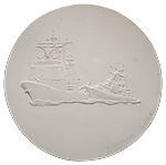 Лот из символического жетона «Два тарана» и модели лицевой стороны жетона. Жетон — ММД, 2014 г. Нейзильбер; 5,08 г (по сертификату). Диаметр 22,5 мм. Рубчатый гурт. Модель — гипс. Диаметр 145 мм. На об. ст. — карандашный автограф автора. Сохранность отличная. (2)
