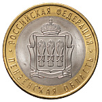 10 рублей 2014 года, СПМД, Пензенская область. Биметалл, 8,47 г. Производственный брак монетного двора: нарушение соосности расположения изображений на монете — разворот лицевого штемпеля по отношению к оборотному примерно на 15 градусов, из-за ослабления крепления фиксации рабочего штемпеля. Сохранность отличная.