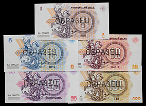 Новороссия, ЦРБ. Комплект «Образцовых» расчетных знаков различных номиналов 2014 года. «100» 2014 года. «25» 2014 года. «10» 2014 года. «5» 2014 года. «1» 2014 года. 5 экземпляров. Сохранность отличная, на реверсе горизонтальная надпечатка «ОБРАЗЕЦ». Сохранность отличная. (5)
