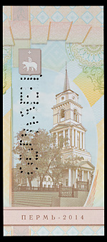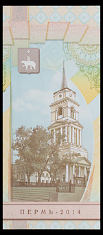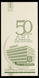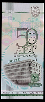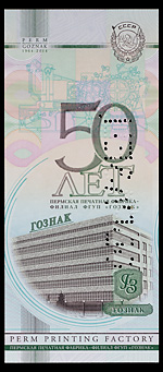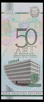 «Гознак» России. Рекламная банкнота «50 лет Гознака», 2014 г., б/№ , Пермь — 2014. С перфорационной пробивкой слова «Образец». Сохранность отличная. Редкая.