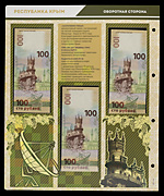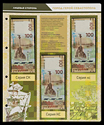 Памятные банкноты России. Билет 100 рублей 2014 года, 3 экземпляра: Серии АА, Аа, аа. Билет 100 рублей 2015 года, 3 экземпляра: Серии КС, СК, кс. 6 экземпляров. Сохранность отличная. Банкноты упакованы в иллюстрированные аннотированные альбомные листы. (6)
