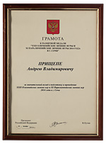 Поощрительная медаль Президента Российской Федерации «XXII зимние Олимпийские игры. XI зимние Паралимпийские игры в г. Сочи» с грамотой от 26 декабря 2014 г. на имя Андрея Владимировича Прищепы. CПМД, 2013 г. Без подписи медальера. Томпак; 117,39 г. Диаметр 59,8 мм. Медаль вложена в оригинальную деревянную коробку с бархатным ложементом, грамота с факсимиле В.В. Путина — в рамке под стеклом. Сохранность отличная. (2)