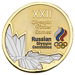 Медаль участника XXII зимних Олимпийских игр (Сочи, 2014 г.). Неизвестное производство, 2013 г. Без подписи медальера. Алюминиевый сплав, плексиглас, эмали; пластик; 65,53 г. Размеры 71,0×70,0 мм (овал), медаль вложена в презентационную подставку из пластика. Медаль с подставкой вложены в оригинальную упаковочную коробку. Сохранность отличная.