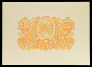 Пробный односторонний оттиск аверса Государственного Казначейского Билета 10 рублей (1961 года). Оттиск оранжевого цвета на простой бумаге. Сохранность отличная. Очень редкий.