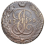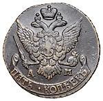 5 копеек 1795 года, АМ. «Павловский перечекан». Гурт сетка. Медь, 45,61 г. Сохранность почти отличная, приятная плотная патина. ГМ# 36.5 (очень редкая). Brekke# 15 (черта с точкой). Уздеников# 2889 (черта). Дьяков# 799 (R3). Биткин# 177 (R3). Григорьев, Капустин, Черноухов# 33.1 (черта с точкой). Очень редкие, 20 рублей по Ильину.