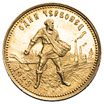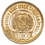 Один червонец 1923 года, ПЛ. Полированный чекан. Золото, 8,62 г. Сохранность полированная, царапины. Петров, Федорин# 15а (Р-5). ФедоринVI# 1 (П) Р-5 (см. Приложение, С.496–498). Крайне редкий.