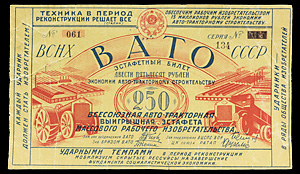 Всесоюзная авто-тракторная выигрышная эстафета массового рабочего изобретательства. ВСНХ СССР «ВАТО». Эстафетный билет 250 рублей 1932 года, серия 134, № 061. Сохранность очень хорошая. Редкий.