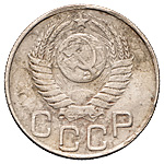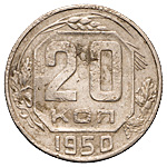 20 копеек 1950 года. Лиц. ст.: шт. 3 — без венчика, буква «Р» ниже, звезда плоская . Об. ст.: шт. А — по модели предыдущих лет: цифры даты утолщены и расставлены. Мельхиор, 3,48 г. Сохранность очень хорошая, небольшая деформация поля монеты. ФедоринVI# 87. Очень редкие. Очень редкий и интересный типовой вариант особо выделяемый в нумизматической литературе!