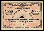 Государственная фабрика Объединений «Союзшерсть», Рассказово, Тамбовская область. Хозрасчетный ордер 5000 рублей н/д, № 146. Сохранность почти отличная. Рябченко # 4437 (без оценки). Очень редкий.