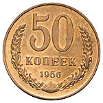 50 копеек 1956 года, с надчеканом номера сплава А12. Пробные. Лиц. ст.: штемпель 5 копеек 1953 года, тип II, справа от герба клеймо номера сплава А12. Об. ст.: штемпель образца 1953 года, тип III, но дата 1956. А12 — медно-цинковый сплав золотисто-желтого цвета, 4,72 г. Сохранность отличная, красивый штемпельный блеск. Ушаков, Федорин# 262 Р-3, приведено фото данного экземпляра! ФедоринVI, Приложение 6, С.436.5. Очень редкие.