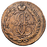 2 копейки 1796 года, АМ. Медь, 18,79 г. Сохранность очень хорошая, следы коррозии и чистки. ГМ# 34.15 (редкая). Brekke# 193 (черта с точкой). Уздеников# 2923 (черта). Дьяков# 838 (R3). Биткин# 874 (R3). Григорьев, Капустин, Черноухов# 35.2 (!!). Очень редкие, 20 рублей по Ильину.