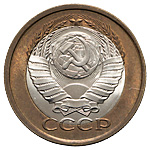 5 копеек 1990 года (ЛМД). Опытный экспериментальный образец: чекан на составной биметаллической заготовке: ободок — медно-цинковый сплав, вставка — медно-никелевый сплав, 4,77 г. Гурт рубчатый. Сохранность отличная, штемпельный блеск. Крайне редкие.
