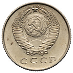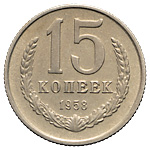 15 копеек 1958 года. Невыпущенная в обращение монета. Образцовый экземпляр с пробным штемпелем аверса — звезда в гербе большая граненая, правая гребенка с уступом, с островом Мадагаскар. Медно-никелевый сплав, 2,52 г. Сохранность почти отличная, легкая патина, штемпельный блеск. Ушаков, Федорин# 405 (R-4). ФедоринVI, Приложение 6, С.461.3. Крайне редкие.