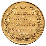 5 рублей 1823 года, СПБ-ПС. Золото, 6,48 г. Сохранность очень хорошая, тонкие царапины, следы чистки. ГМ# 17.1. Severin# 392. Уздеников# 0197 (точка). Биткин# 22. Довольно редкие.