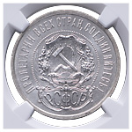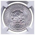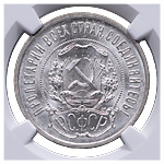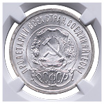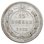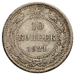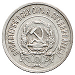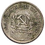 20 копеек 1921 года. Лиц. ст.: шт. 1.2 — ости над картушем длинные. Серебро, 3,63 г. Сохранность почти отличная, лёгкая патина. ФедоринVI# 2.