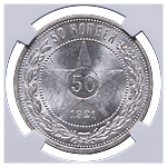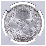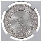 50 копеек 1921 года, АГ. Серебро. Монета в пластиковой капсуле (слабе) NGC, MS 64+. ФедоринVI# 1.