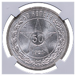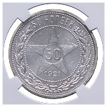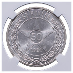 50 копеек 1921 года, АГ. Серебро. Монета в пластиковой капсуле (слабе) NGC, MS 62. ФедоринVI# 1.