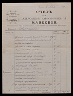 Счет от Александры Варфоломеевны Майковой. Столешников пер., д. Савостьянова, ход рядом с магазином Бургхард. Принимаются заказы на платье и полное приданое. На фирменном бланке магазина на сумму 144 рубля 43 копейки 1891 года. Сохранность очень хорошая.