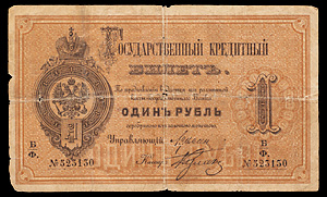 Государственный Кредитный Билет 1 рубль 1886 года, Б/Ф. № 523130. Сохранность очень хорошая. Кардаков# I.1.593 (2 дойчмарки). Денисов# К-8б.3. Рябченко# 522. Довольно редкий.