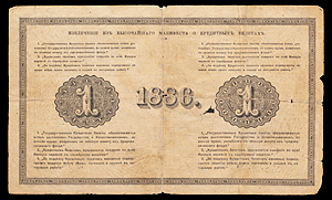 Государственный Кредитный Билет 1 рубль 1865 года, № 37632014. Сохранность удовлетворительная, склейки. Кардаков# I.1.513 (4 дойчмарки). Денисов# К-1.15. Рябченко# 445. Довольно редкий.