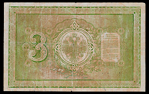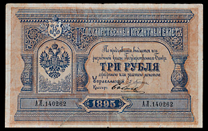 Государственный Кредитный Билет 3 рубля 1895 года, АЛ. 140262. С подписями управляющего Э. Плеске, кассир Соболев. Сохранность очень хорошая. Кардаков# I.1.655. (3 дойчмарки). Денисов# К-16б.1. Рябченко# 564. Довольно редкий.