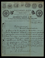Торговый Дом и Фабрика перьев и плюмажей Первая в России усовершенствованная в 1878 году Николая Ивановича Дементьева и Ко. При конторе склад французских цветов из лучших домов Парижа. Контора и фабрика в Москве. Письмо владельца фабрики