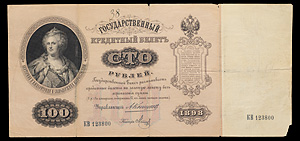 Государственный Кредитный Билет 100 рублей 1898 года, КВ 123800. С подписью управляющего А. Коншина, кассир Метц. Сохранность очень хорошая. Кардаков# I.1.698 (7 дойчмарок). Денисов# К-28.3. Рябченко# 705б. Довольно редкий.