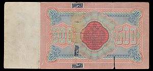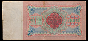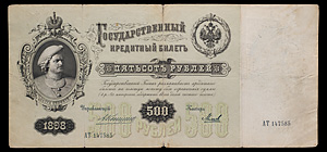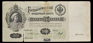 Государственный Кредитный Билет 500 рублей 1898 года, АП 054635. С подписью управляющего С. Тимашева, кассир Михеев. Сохранность хорошая, склейки. Кардаков# I.1.691 (10 дойчмарок). Денисов# К-29.2. Рябченко# 706а. Редкий.