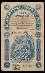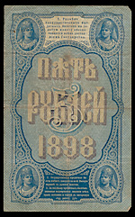 Государственный Кредитный Билет 5 рублей 1898 года, АХ 973257. С подписью управляющего Э. Плеске, кассир Михеев. Сохранность очень хорошая. Кардаков# I.1.680 (2,5 дойчмарки). Денисов# К-26.1. Рябченко# 703. Довольно редкий.