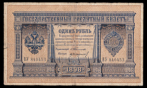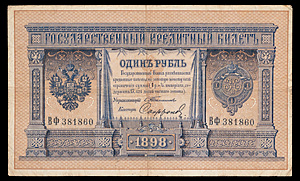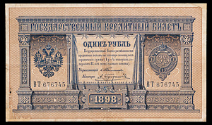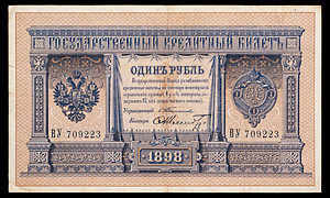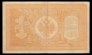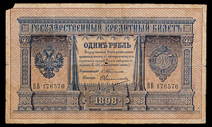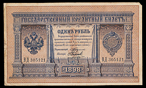 Государственный Кредитный Билет 1 рубль 1898 года, ВД 305121. С подписью управляющего С. Тимашева, кассир Наумов. Сохранность очень хорошая+. Кардаков# I.1.686. Денисов# К-24.2. Рябченко# 701а.