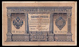 Государственный Кредитный Билет 1 рубль 1898 года, ВУ 814479. С подписью управляющего С. Тимашева, кассир Чихиржин. Сохранность очень хорошая. Кардаков# I.1.686. Денисов# К-24.2. Рябченко# 701а.