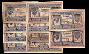 Государственный Кредитный Билет 1 рубль 1898 года, с порядковым номером, 10 экземпляров с подписью управляющего И. Шипова, и разными подписями кассиров: Афанасьев, Барышев, Богатырев, Я. Метц, Михеев, Морозов, Овчинников, Сафронов, Чихиржин, Ф. Шмидт. Сохранность очень хорошая-хорошая. Кардаков# I.1.707. Денисов# К-24.4. Рябченко# 701в. (10)