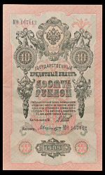 Государственный Кредитный Билет 10 рублей 1909 года, МО 167112 (выпуск Временного Правительства). С подписью управляющего Шипова, кассир Былинский. Сохранность отличная. Кардаков# I.1.711. Денисов# К-33.3. Рябченко# 711б.