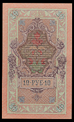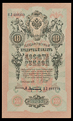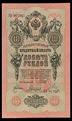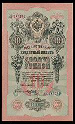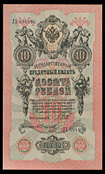 Государственный Кредитный Билет 10 рублей 1909 года, ЕН 985732. С подписью управляющего И. Шипова, кассир Я. Метц. Царский выпуск. Сохранность отличная. Кардаков# I.1.711. Денисов# К-33.3. Рябченко# 711б.