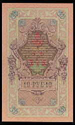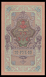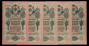 Государственный Кредитный Билет 10 рублей 1909 года. 5 экземпляров с подписью управляющего И. Шипова и различными подписями кассиров. Выпуск временного правительства. Сохранность почти отличная. Кардаков# I.1.711. Денисов# К-33.3. Рябченко# 711б. (5)