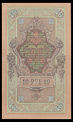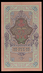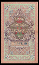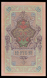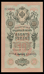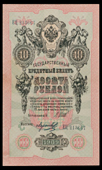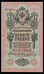 Государственный Кредитный Билет 10 рублей 1909 года, ВД 238008. С подписью управляющего А. Коншина, кассир Афанасьев. Сохранность почти отличная. Кардаков# I.1.703. Денисов# К-33.2. Рябченко# 711а.
