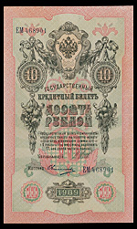 Государственный Кредитный Билет 10 рублей 1909 года, ЕМ 468901. С подписью управляющего И. Шипова, кассир Овчинников. Царский выпуск. Сохранность почти отличная. Кардаков# I.1.711. Денисов# К-33.3. Рябченко# 711б.