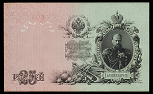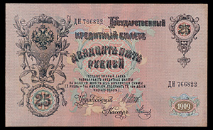 Государственный Кредитный Билет 25 рублей 1909 года, ДН 766822. С подписью управляющего И. Шипова, кассир Метц. Выпуск временного правительства. Сохранность почти отличная. Кардаков# I.1.712. Денисов# К-35.2в. Рябченко# 712а.
