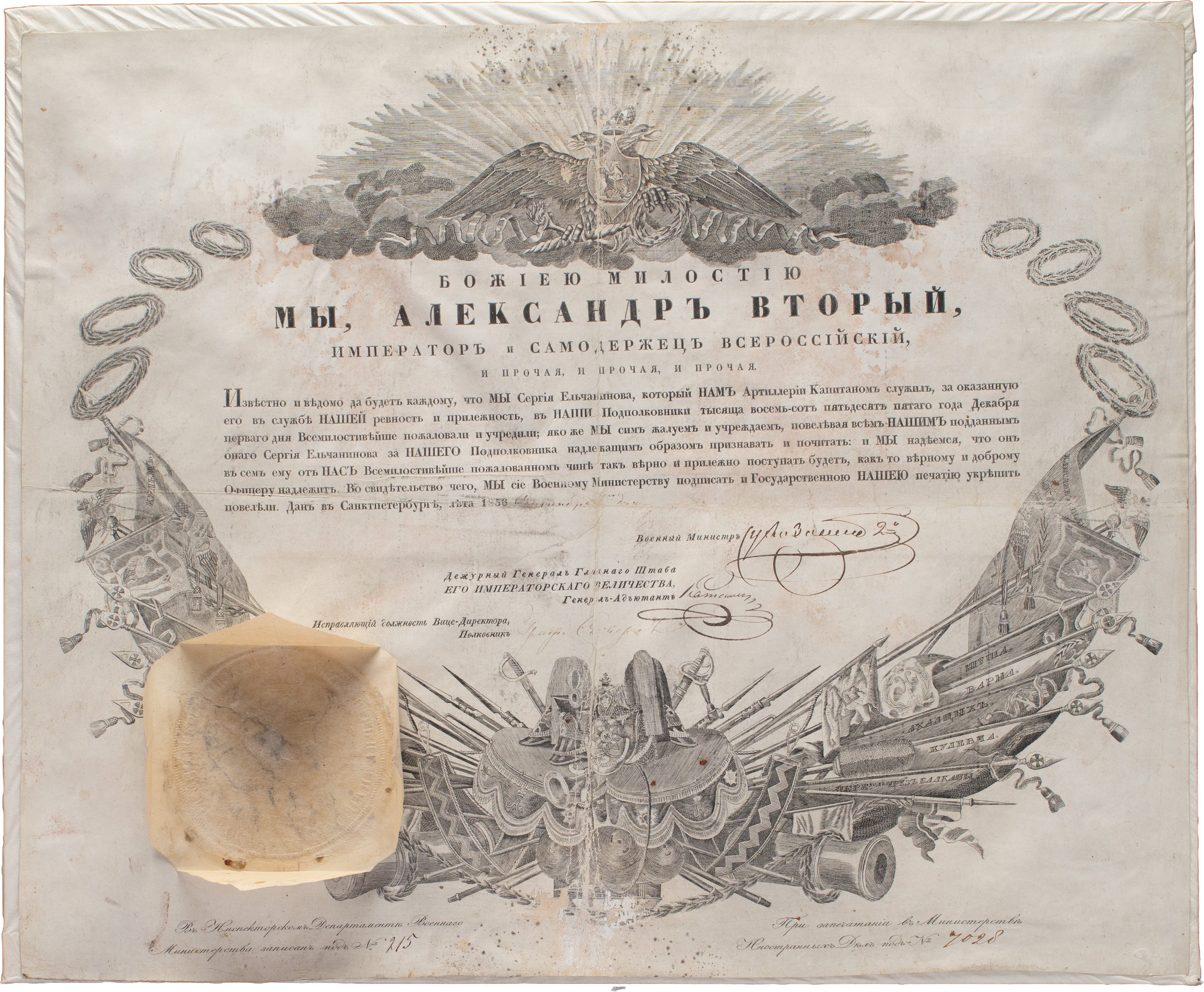 Патент Сергея Ельчанинова на чин подполковника. Подписи военного министра Н.О.Сухозанета, дежурного генерала Главного штаба Его Императорского Величества генерал-адъютанта А.А.Катенина и исправляющего должность вице-директора инспекторского департамента Военного министерства полковника графа Е.Е.Сиверса (автографы). Государственная печать. С.-Петербург, сентябрь 1856 г. Бумага, чернила, сургуч; печать типографская, рукопись. Патент оформлен в декоративную картонную раму. Размеры: патента в свету 355×433 мм, рамы 520×600 мм. Сохранность очень хорошая, следы влаги, сургуч частично утрачен. Редкий.